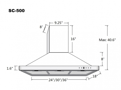 Sometimes strength and beauty can co-exist. Strong and sturdy, yet attractive and unimposing, the SC500 combines the eye-pleasing design of European hoods with the power and efficiency of North American fans. A perfect match. Give your kitchen the look, feel, and capability that you have always wanted. Fitted with time-delay off options up to nine minutes, bright halogen lights spaced for optimum light distribution, and a digital three-speed push button control panel.