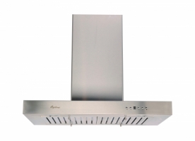 Makes a statment of strength and power as the stainless steel frame gleams under your kitchen lights. It features BAFFLE filters, tow birght halogen lights in each corner, a three speed control panel, and a quiet, powerful motor. The bold design and strong stainless steel frame encasing the fan will make this machine the focus of your kitchen. Fitted with time-delay "OFF" options up to nine minutes.