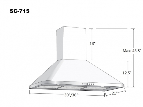 Available in both 30" and 36" wide frames, the SC715 connotes a sense of power and strength. Designed to look and function like a smaller scale industrial strength exhaust fan, this machine will certainly get rid of unwanted odours, grease, and smoke. Features three fan speeds, fron halogen lights, and a nine minute time-delay off function.